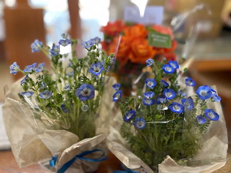 マークさんに当日いただいた青いネモフィラと、東京の友人が届けてくれたオレンジのやさしいお花が受付で皆さんを迎え。