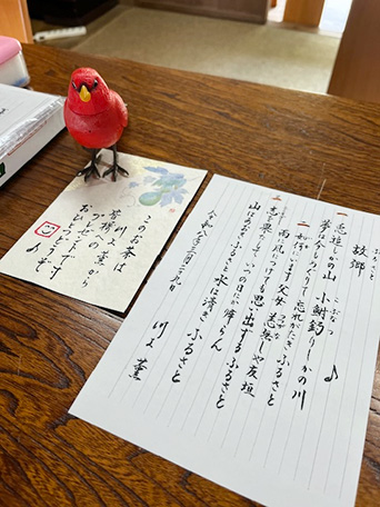 手書きの筆文字「故郷」歌詞カードと、爽やかなお茶は、母(川上薫)から皆さんへの感謝を込めての贈り物。